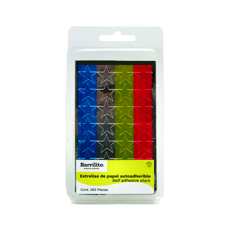 ESTRELLA BARRILITO EP392 C/392PZAS 15MM.PAPEL ADHESIVO BRILLANTE COLORES METALICOS FIUSHA,PLATA,AMARILO ORO Y AZUL.